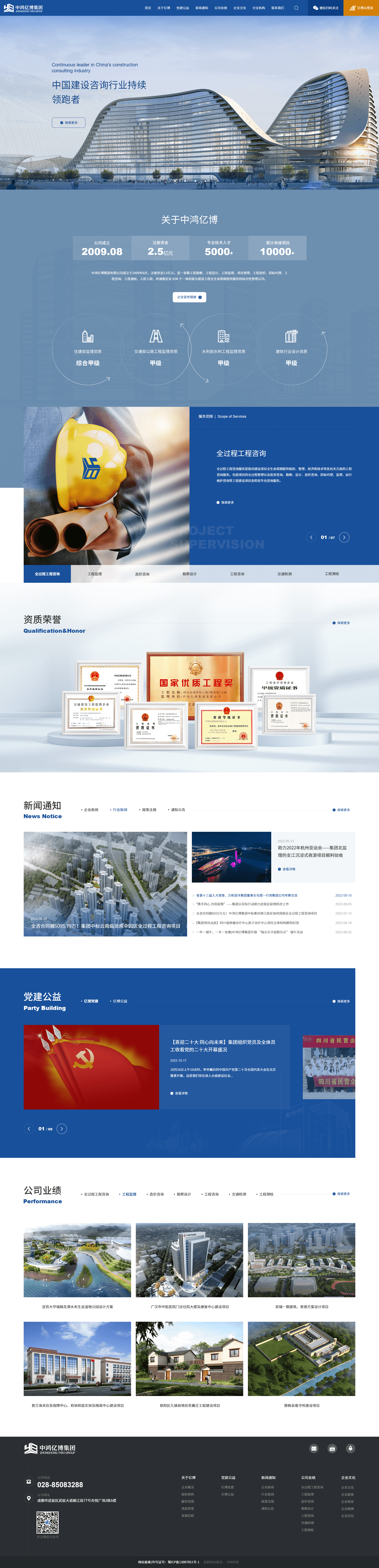 中鸿亿博集团有限公司成立于2009年8月,注册资金5000万元,是一家集项目管理、工程监理、造价咨询、勘察设计、招标代理、工程咨询、工程测绘、人防工程、BIM咨询及检测鉴定于一体的全过程工程管理咨询综合服务商。并于2015年取得工程监理综合资质、勘察设计资质;2016年取得工程造价咨询甲级资质、工程测绘丙级资质;2017年取得招标代理甲级资质、工程咨询单位甲级资信证书;2018年取得军工涉密业务咨询服务安全保密条件备案证书;2020年4月取得水利部水利工程施工监理甲级、水土保持工程施工监理丙级;2020年7月取得交通运输部(全资子公司)公路工程甲级。