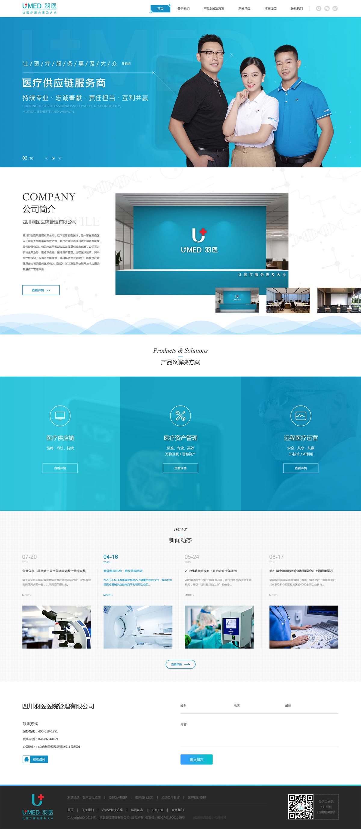 四川羽医医疗管理有限公司,以下简称羽医医疗,是一家在西南区及国内外拥有丰富医疗资源、客户资源和市场资源的创新型医疗服务管理公司。羽医医疗坐落于西部经济发展重点城市成都,建立三大板块主营业务:医疗供应链、医疗资产管理、远程医疗运营。其中医疗供应链主要开展医学影像、外科两大业务方向;医疗资产管理具备完善的服务体系和专业人才体系以及基于物联网技术应用的智慧资产管理体系;远程医疗运营具备完全自主知识产权的远程会诊平台、医生集团及运营管理能力,同时借助最新5G技术和AI的应用,让医疗服务更简单。通过公司全体员工的共同努力,羽医医疗逐渐成为集医疗供应链、医疗资产管理、远程医疗运营、自主软硬件开发为一体的集团化运营服务机构。