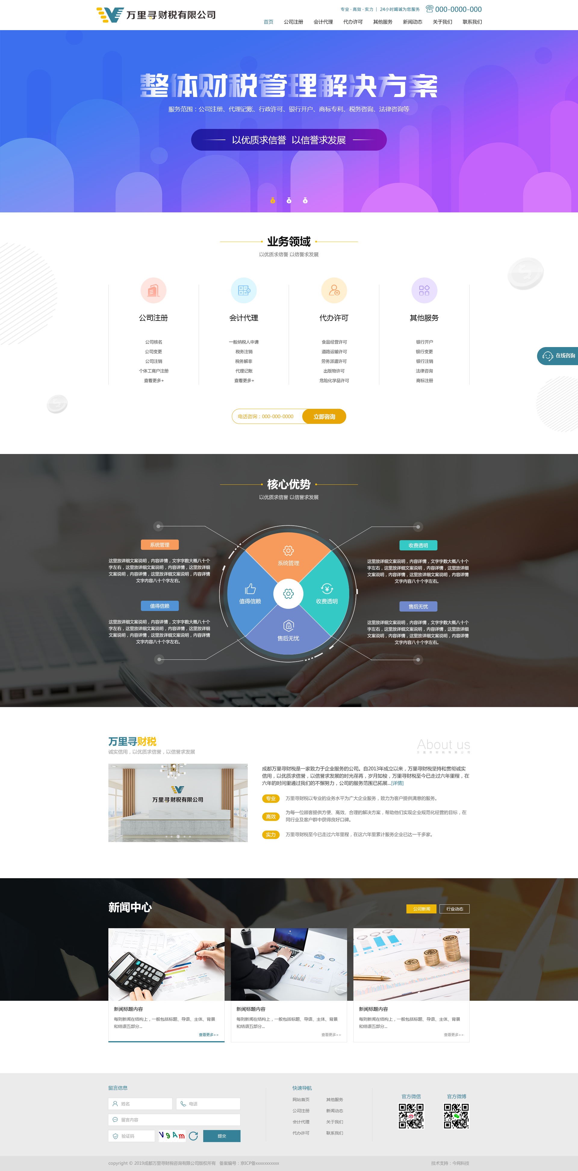 成都万里寻财税是一家致力于企业服务的公司。自2013年成立以来,万里寻财税坚持和贯彻诚实信用,以优质求信誉,以信誉求发展的工作理念。时光荏苒,岁月如梭,万里寻财税至今已走过六年里程,在六年的时间里通过我们的不懈努力,公司的服务范围已拓展至公司注册、代理记账、行政许可、银行开户、商标专利、税务咨询、法律咨询等几大模块。在各个部门的同力合作下能够快速、及时、准确地为客户提供账务处理、汇算清缴、年度