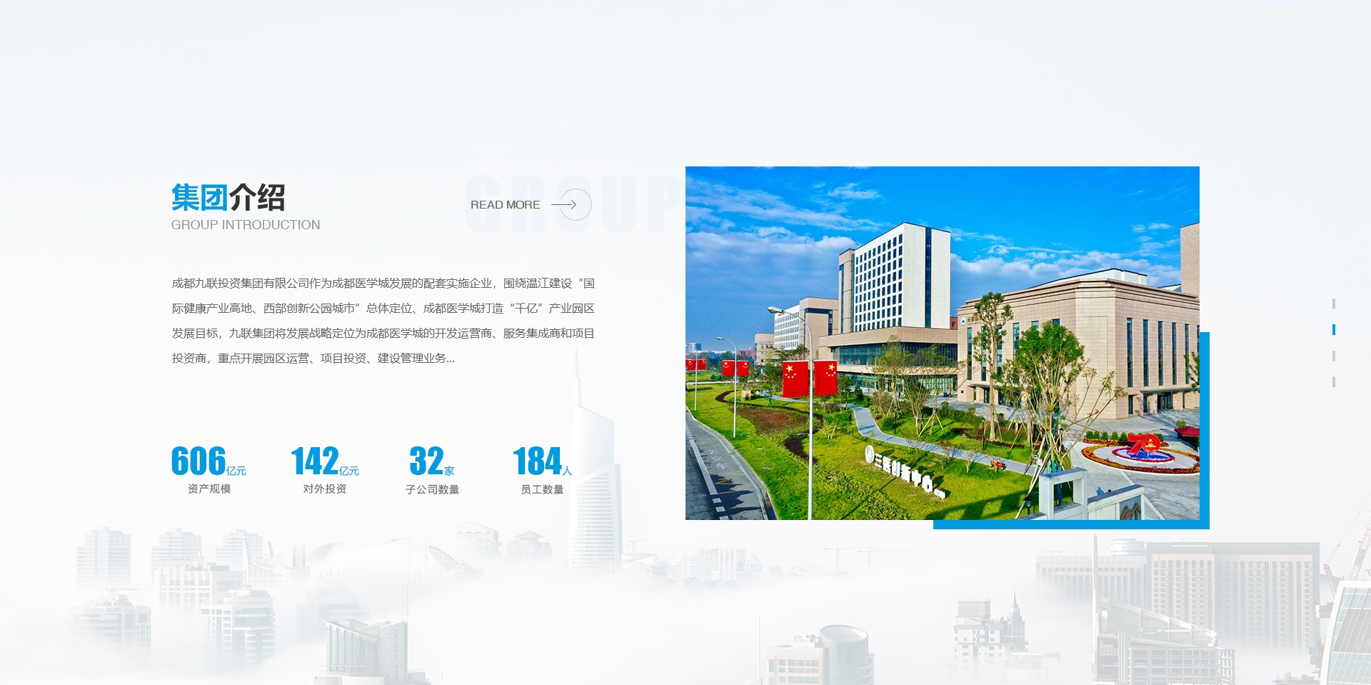 成都九联投资集团有限公司前身为2000年5月成立的成都海科投资有限责任公司。2013年12月整合全区产业类资产及项目后变更主体为成都九联投资有限公司,2019年12月完成集团化改造更名为成都九联投资集团有限公司,是温江区属国有独资公司。作为成都医学城发展的配套实施企业,围绕温江建设“国际健康产业高地、西部创新公园城市”总体定位、成都医学城打造“千亿”产业园区发展目标,九联集团将发展战略定位为成都医