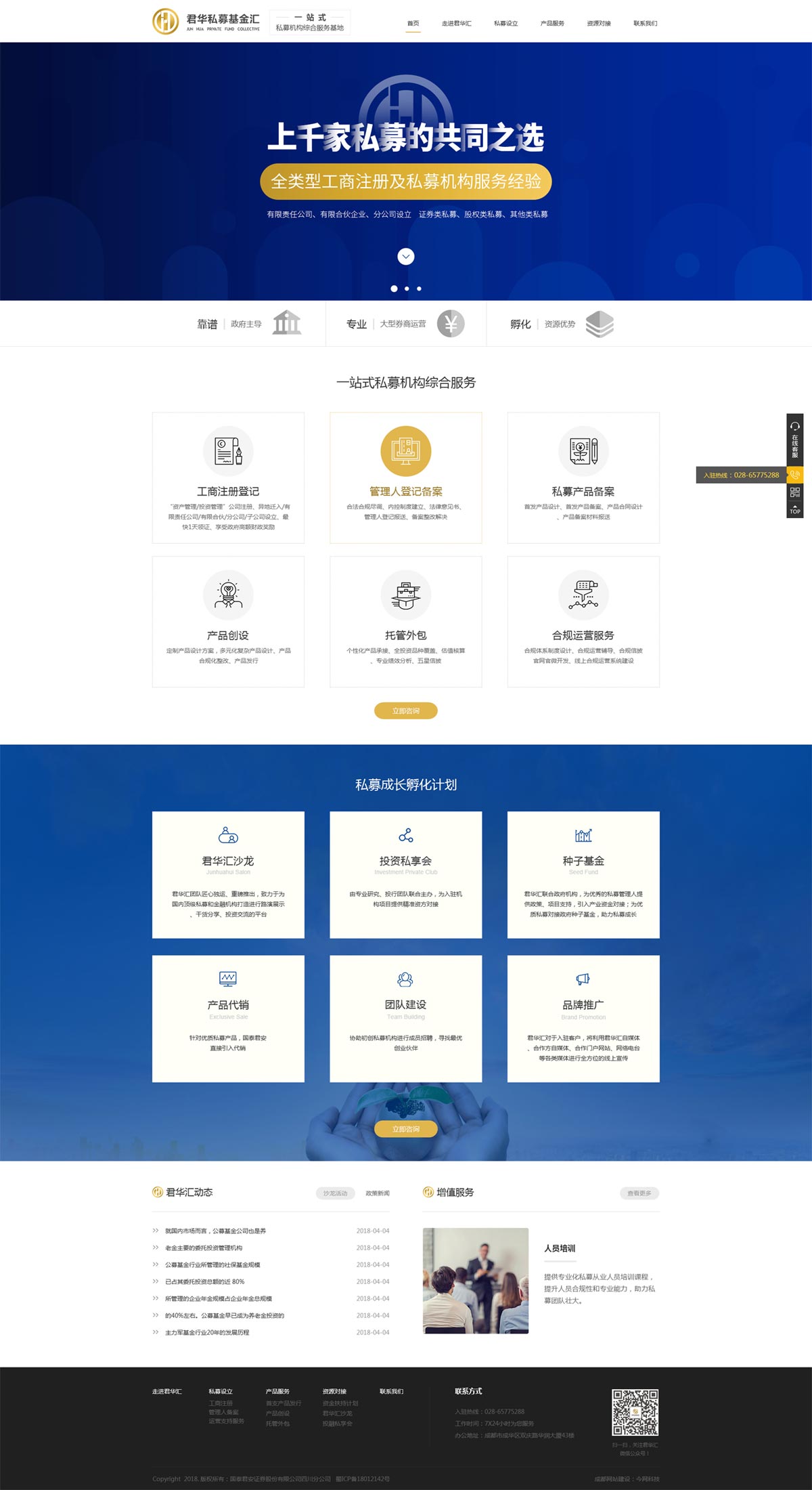 “君华私募基金汇”成立于2017年6月20日,是由成都市成华区人民政府、国泰君安证券股份有限公司四川分公司以及华润置地(成都)发展有限公司三方共同打造的覆盖西南地区辐射全国的私募集聚基地。作为国内首家由券商主导运营的专业化私募服务基地,我们致力于打造国内一流的私募服务专家和价值私募孵化基地。依托国泰君安专业服务能力,融合多家金融机构、私募专业服务机构、政府协会平台等资源能力,为入驻私募机构提供从工商注册、税收政策优惠、管理人登记备案、产品创设、托管外包、估值核算、种子基金、产品代销、资本引荐、资源对接、团队搭建、投研服务、品牌推广、办公入驻等一体化全方位综合金融服务。