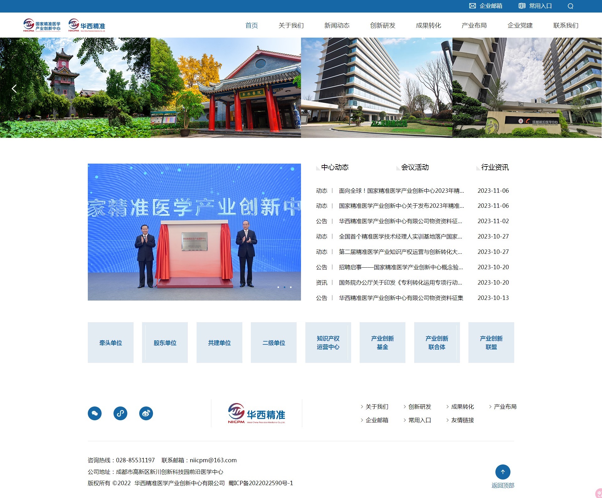 国家精准医学产业创新中心由国家发展和改革委员会于2022年1月批准,由四川大学华西医院牵头组建,作为国内精准医学领域唯一获批的国家产业创新中心,旨在贯彻落实创新驱动发展战略、对标国际前沿技术方向、紧贴精准医学发展重大需求,整合集聚各方资源,构建“政医产学研资用”协同创新体系,加快医药产品成果转化应用。